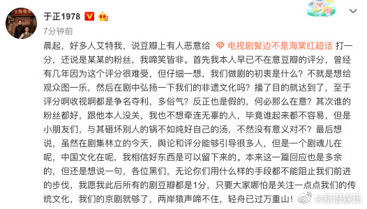 于正回应鬓边被恶意打低分:并不在意评分和收视